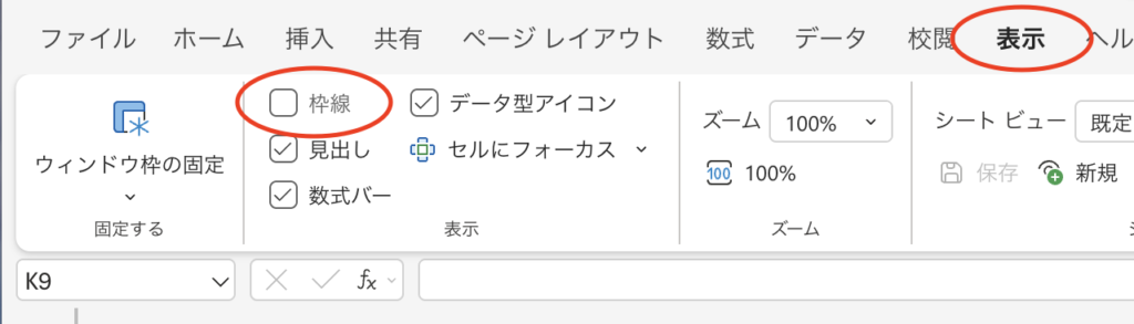 枠線の消し方は、「表示」のタブからリボンの「表示」にある「枠線」のチェックを外すだけです。