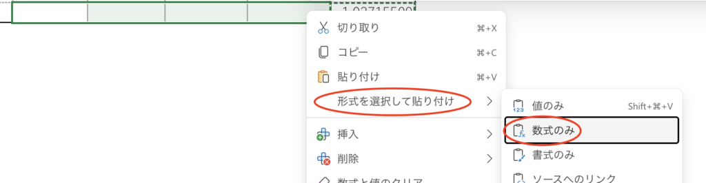 そこから「形式を選択して貼り付け」で「数式のみ」をクリックします。