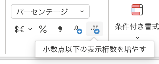 小数点以下も表示したければ、同じく「数値」にある小数点以下の表示桁数を増やすボタンを使いましょう。