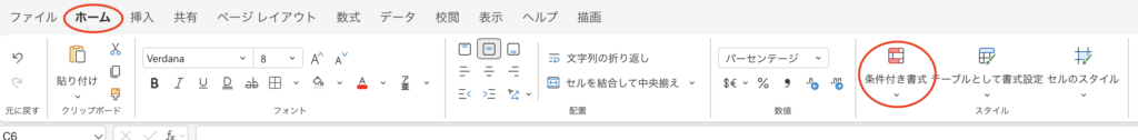 なんて思いついたら、対象のセルをアクティブにしたうえで、「ホーム」の「スタイル」から「条件付き書式」を選択してください。