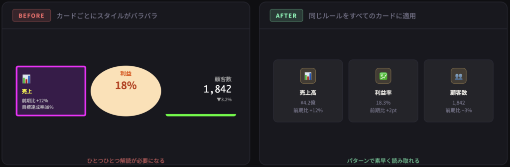 それが狙った効果ならともかく、見て「???」となる資料はフツーは作りたくないと思うので、なるべく読み手に「これは何の意図だろう…」と考え込ませないようにシンプルに作るのが肝要です。