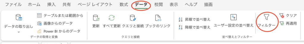 「データ」タブから「並べ替えとフィルター」の漏斗ボタンを使います。