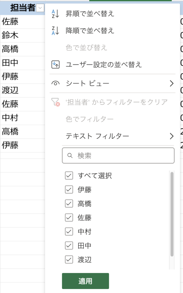 試しに「佐藤さんのデータだけ見たい」ということで「すべて選択」のチェックを外し、「佐藤」だけにチェックを入れます。んで、「適用」をぽちっとな。