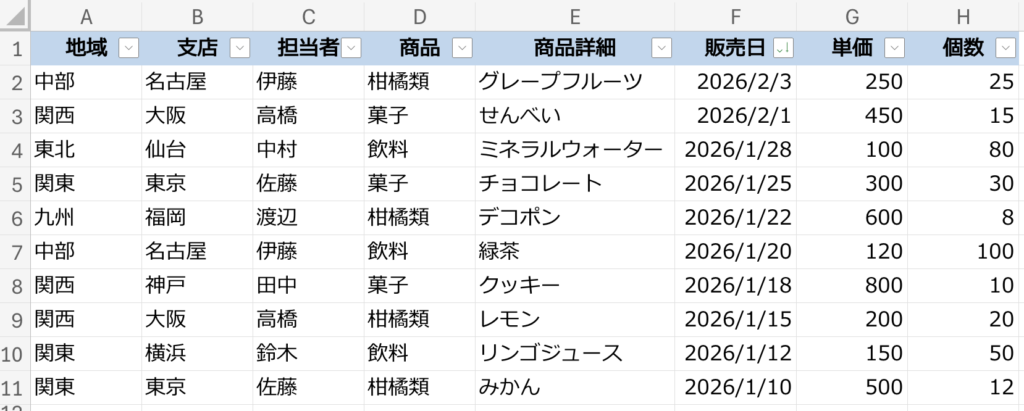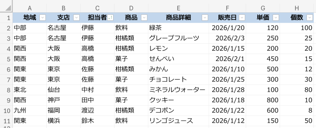 SUMIF・SUMIFS関数で使ったダミーデータをもう一度見てみましょう。