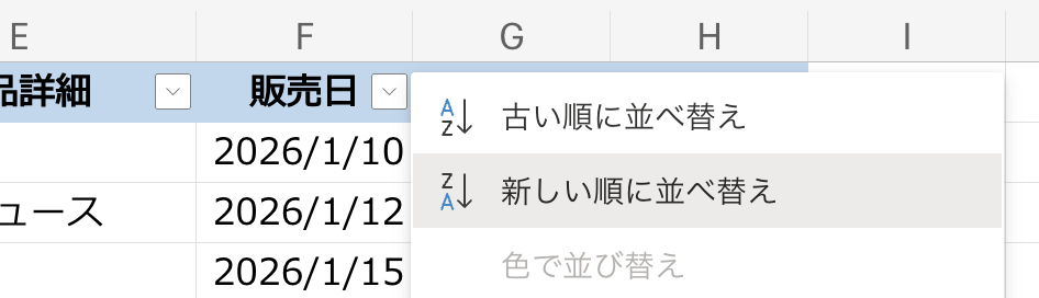 日本語にはちょっと弱いけど、数字には滅法強いExcelちゃん、販売日を「新しい順に並べ替え」してもらうと。