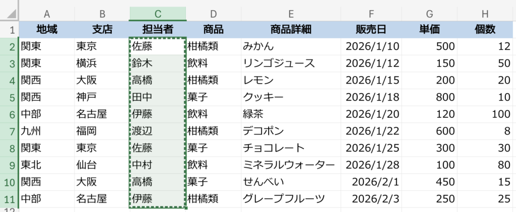 担当者別の販売をあれこれ見るために、担当者を漏れなくピックアップするとします。