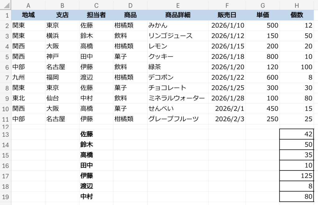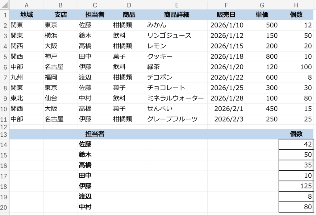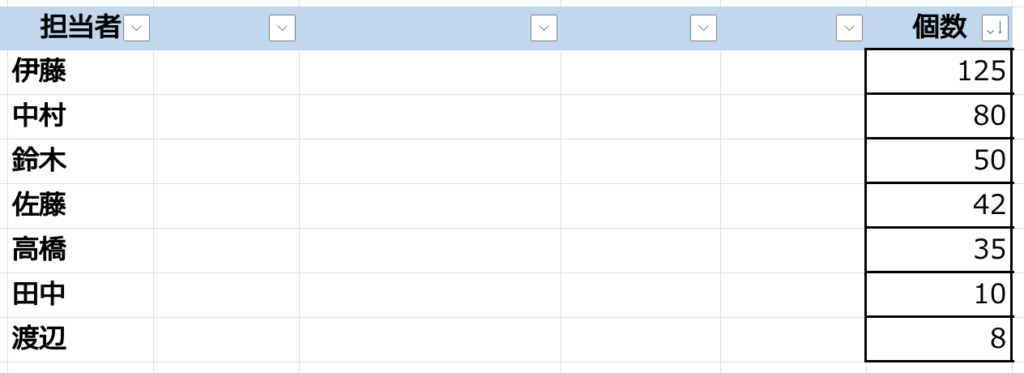 こんな風に、担当者がそれぞれいくつ販売したのか個数がわかりました。