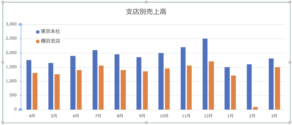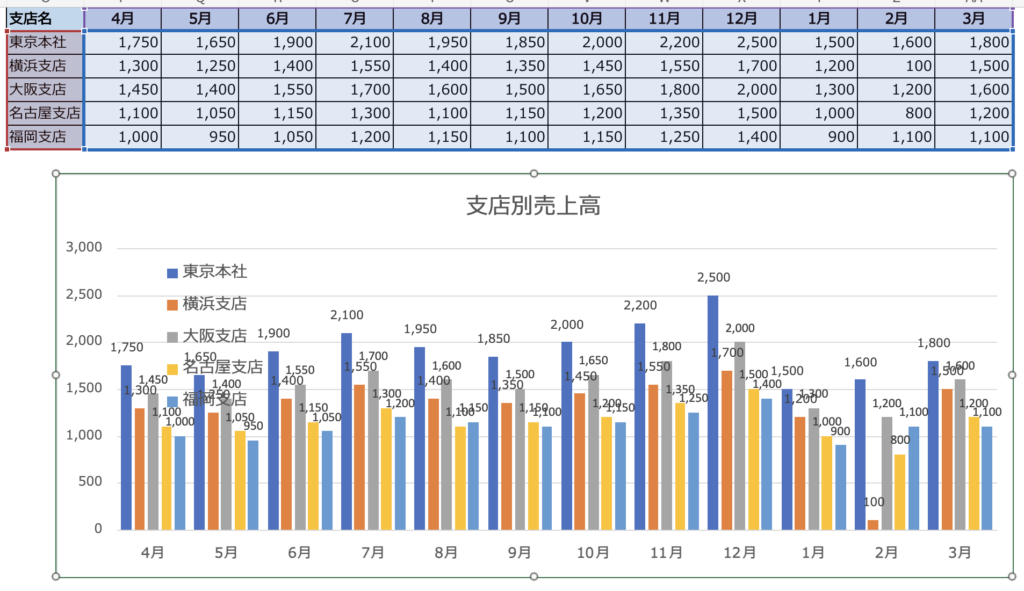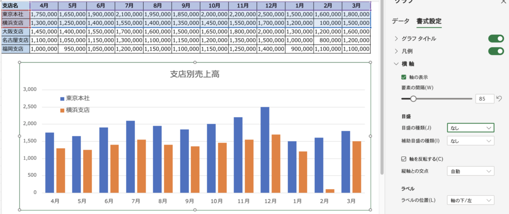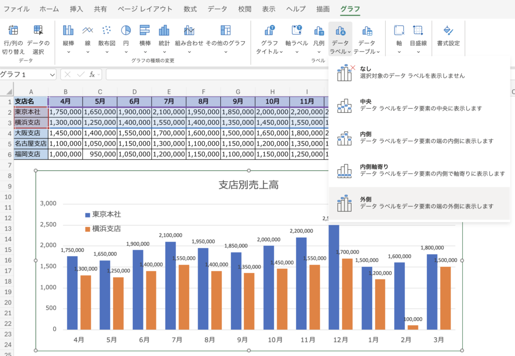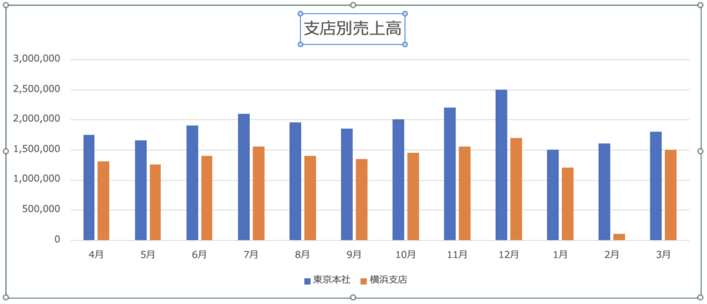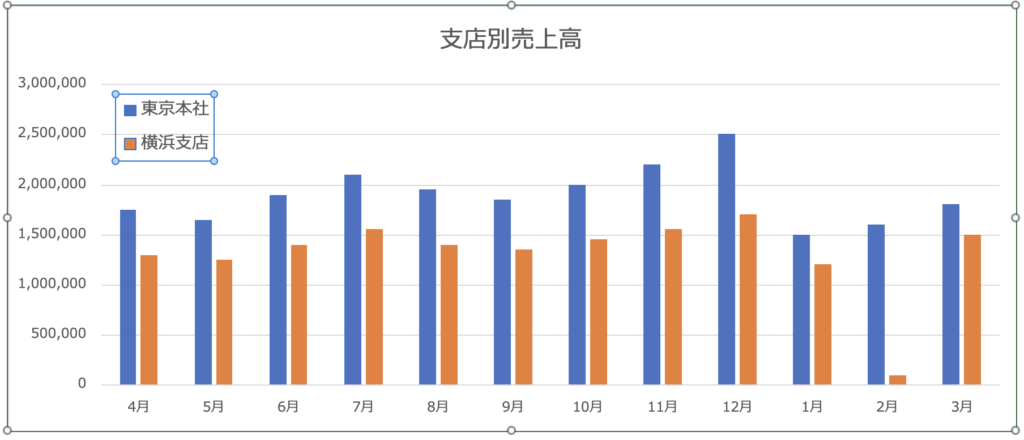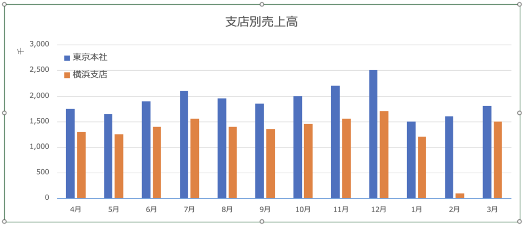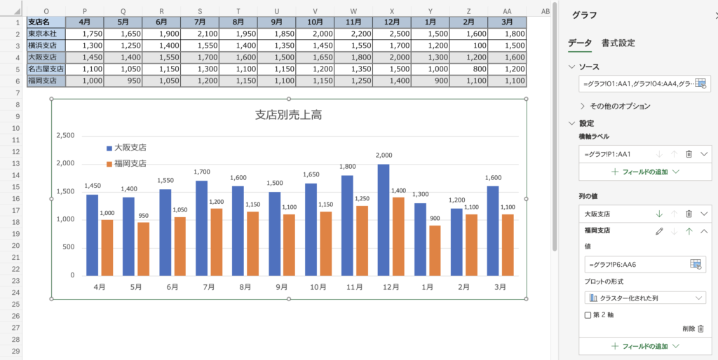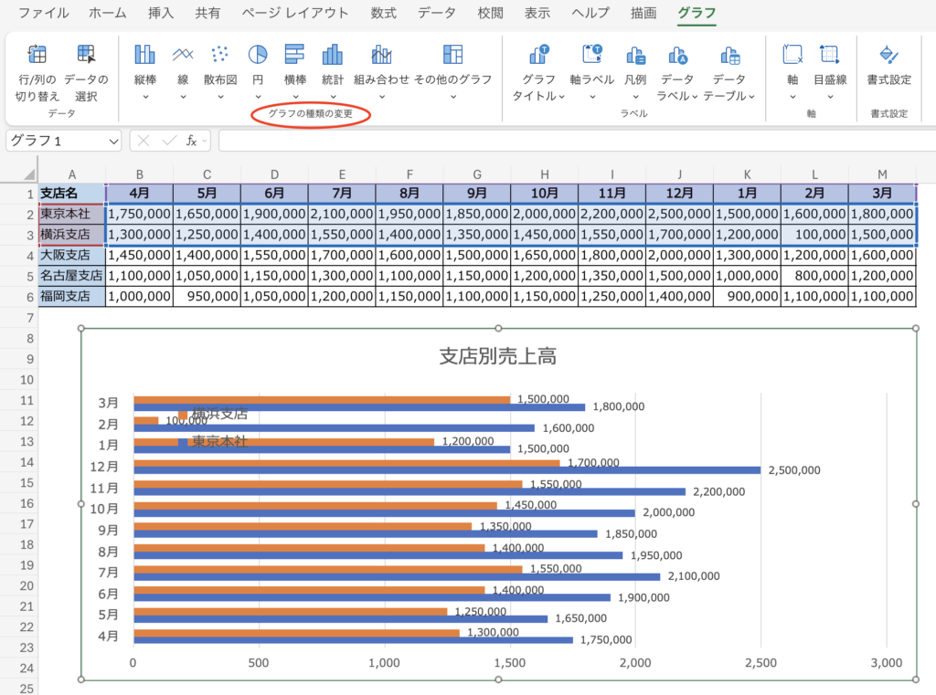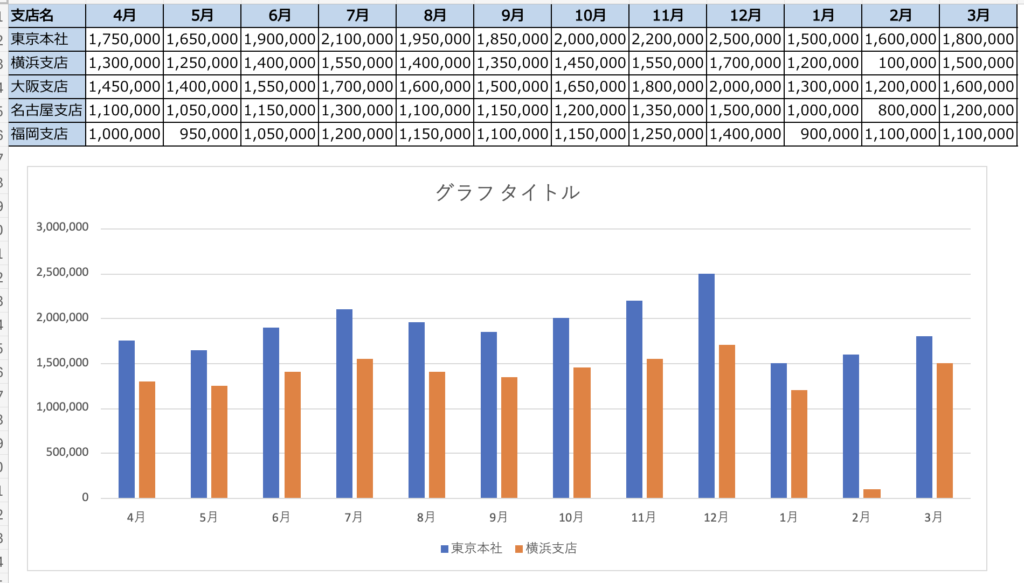 東京本社と横浜支店だけのグラフを作ったけれど、ほかの支社も含めたいな。