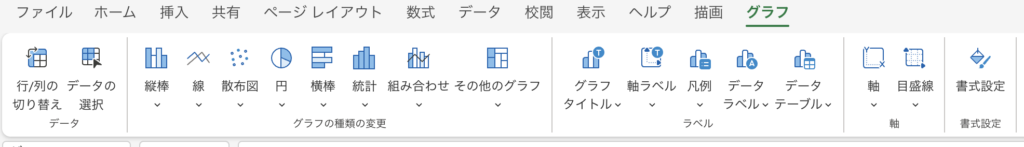 グラフのあれこれを弄るときは、グラフエリアを選択すると出現する「グラフ」タブが便利です。