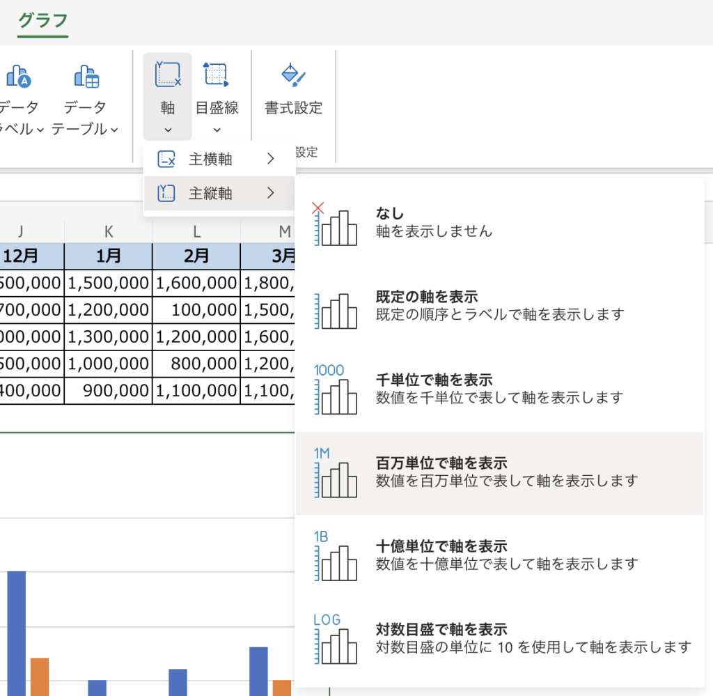 そんなときは、グラフのオプションから軸の単位を変更してしまいましょう。千や百万の単位にすると、見やすくなるグラフが多いと思います。