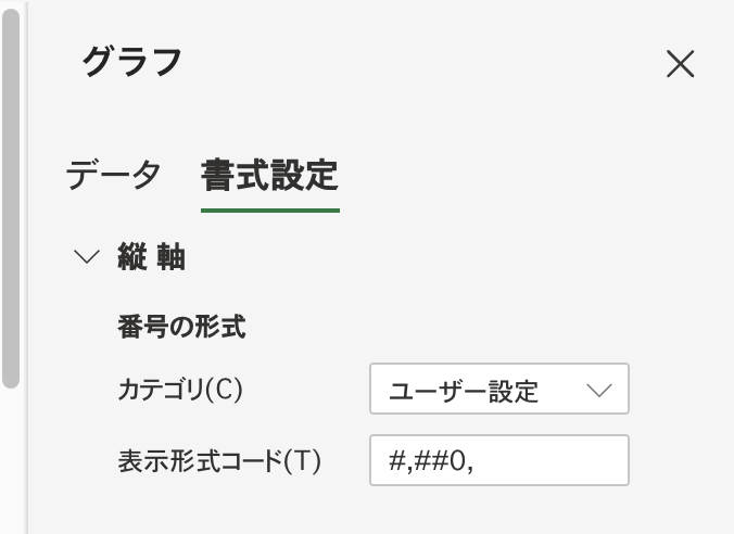 縦軸の書式設定の中から、軸の番号の表示形式を指定する箇所を探してください。