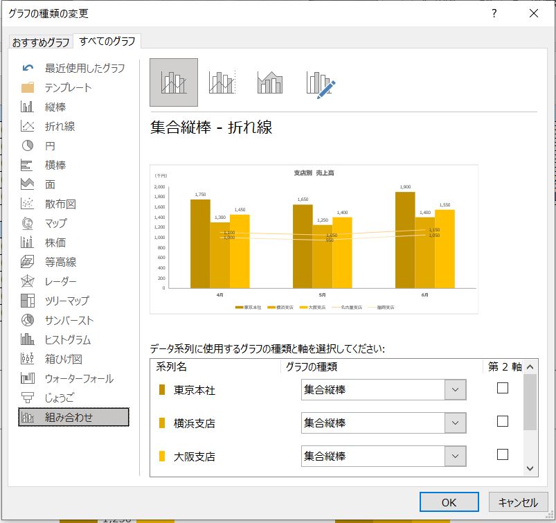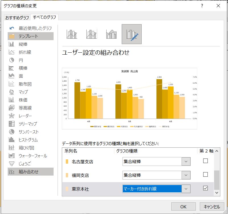 とりあえず東京本社の営業利益率を追加して「OK」して、先程と同じように「グラフの種類の変更」から「組み合わせ」を見ると、系列がひとつ増えています(すみません、下の画像は系列名を「営業利益率」に変更する前のモノで、わかりづらくなっています)。