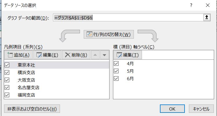 データの追加は、グラフを選択して「データの選択」をぽちっとやるとこんな風に出てきます。