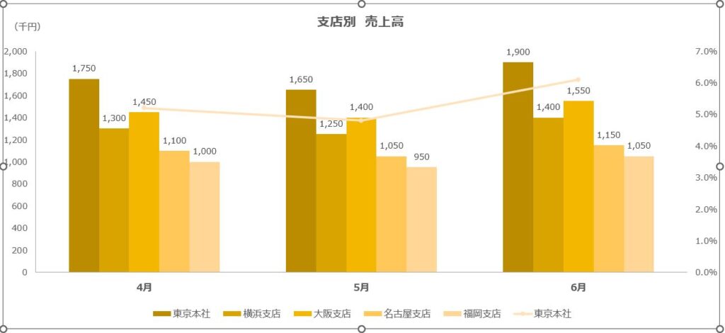 左側の「千円」の軸とは全然別のデータを指定できるので、それで複合グラフを作成することが可能なのです。