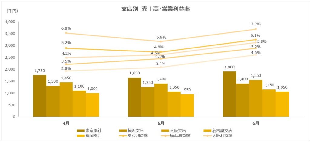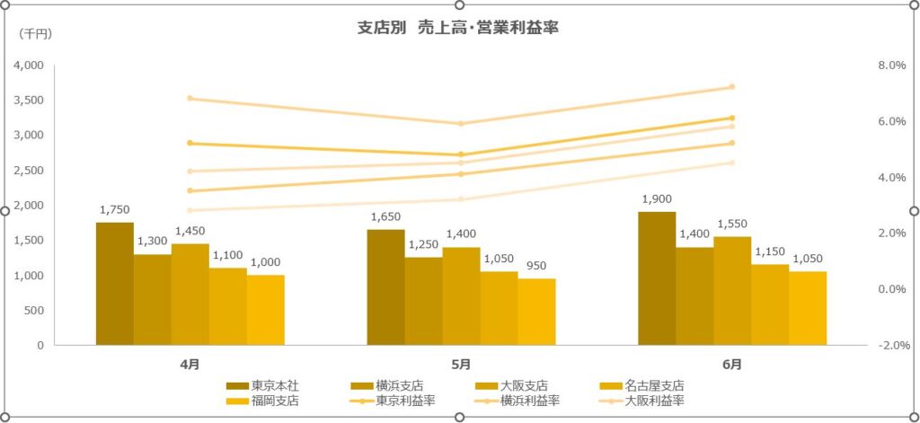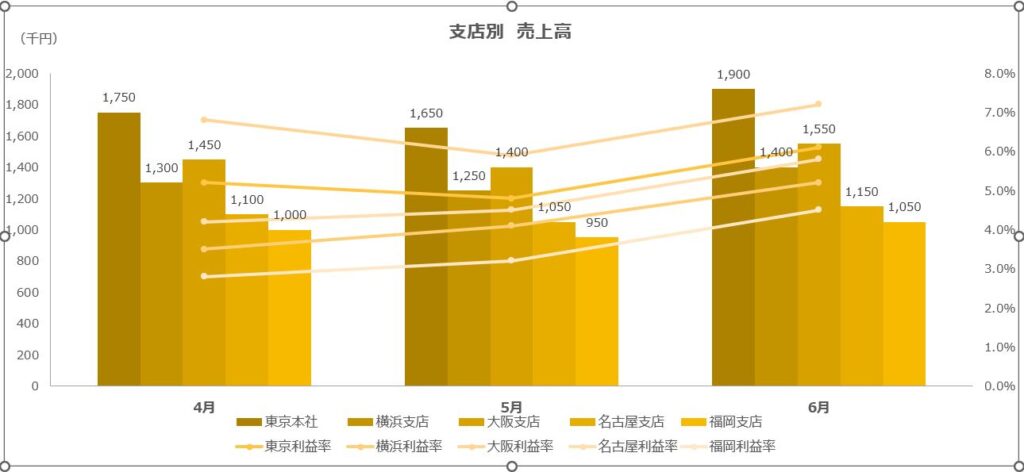 3軸グラフのことは一旦忘れて、ほかの支店の営業利益率も系列をどんどん追加していきましょう。