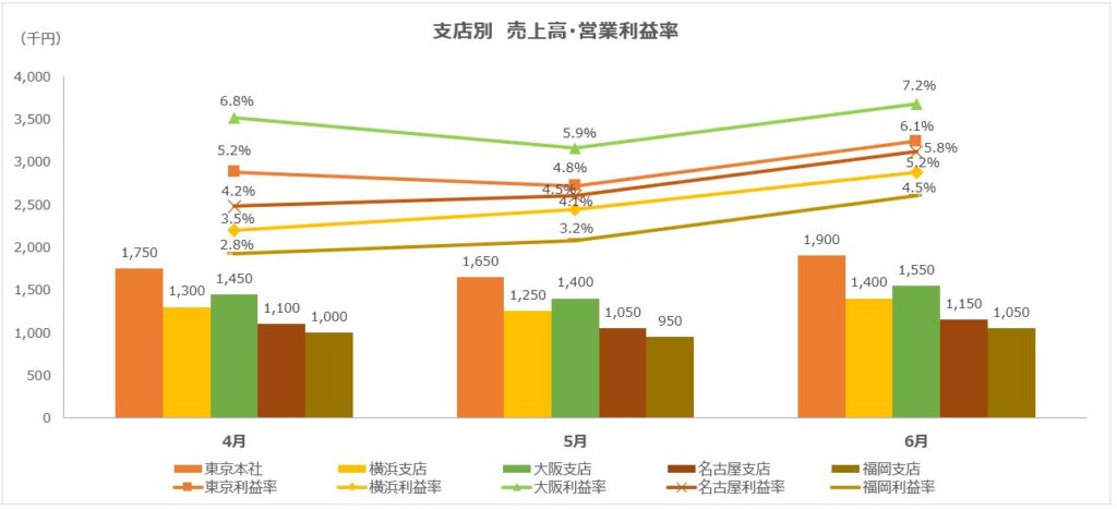 これだとちょっと煩雑になるので、第一四半期の4月から6月だけ取り出して、ここに利益率の推移も追加してみましょう。