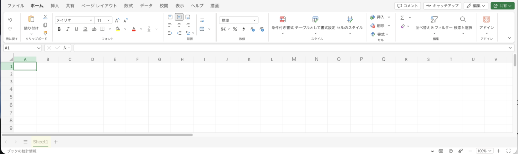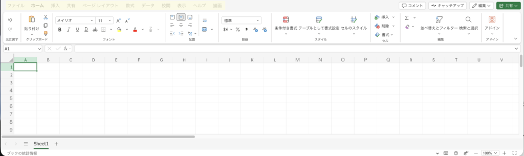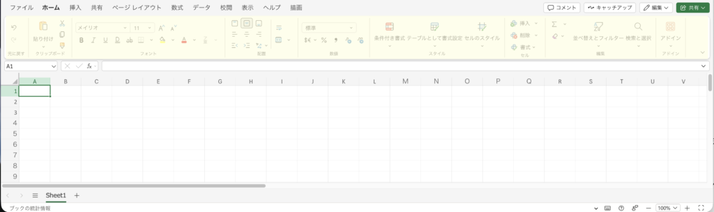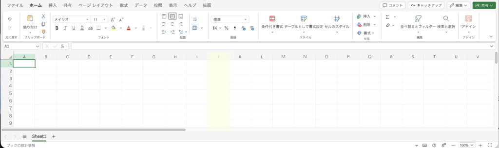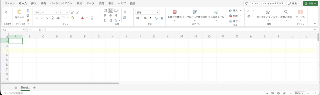 現在カーソルを置いているセルは、画像のA1のように濃い色で囲まれ、行見出しの番号と列見出しのアルファベットに色がつきます。