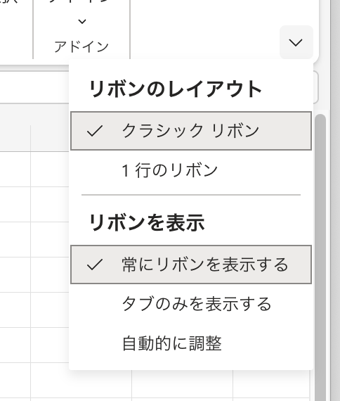結構なスペースを取るので表示が気に入らなかったら、リボンの右下端にある▼から表示方法を切り替えてみてください。
