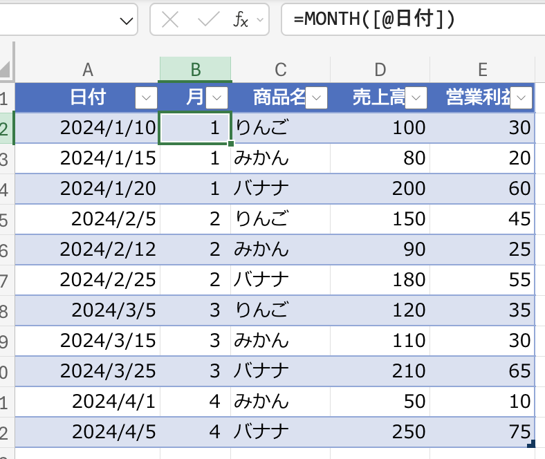 元のテーブルに「日付」から「月」をピックアップしたカラムを追加します。