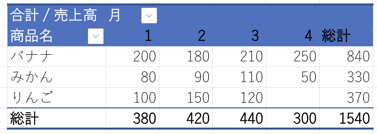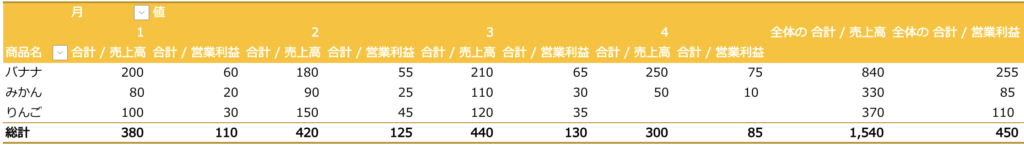 この場合は、「商品名」の中から「バナナ」を、更に「月」から「1」を指定するのでこういう記述になります。