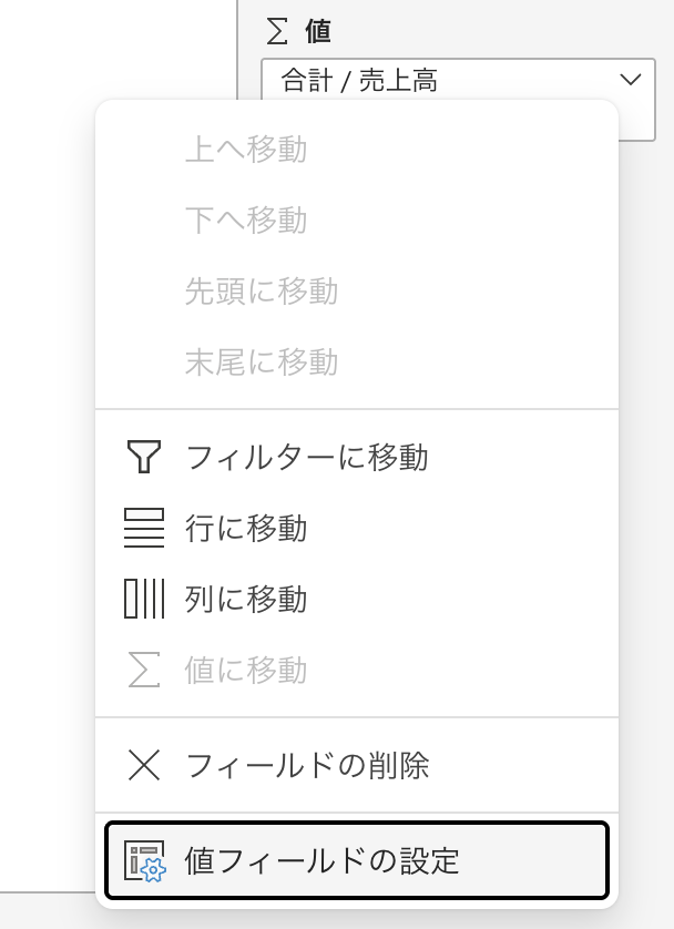 値の領域で「合計/売上高」を選択し、▼から「値フィールドの設定」を選択します。
