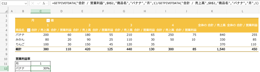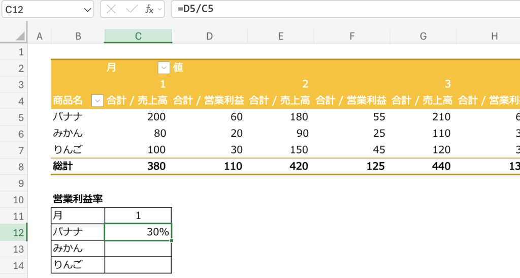 1月の商品別の営業利益率を出してみようということで、C12セルでこんな計算をやってみました。