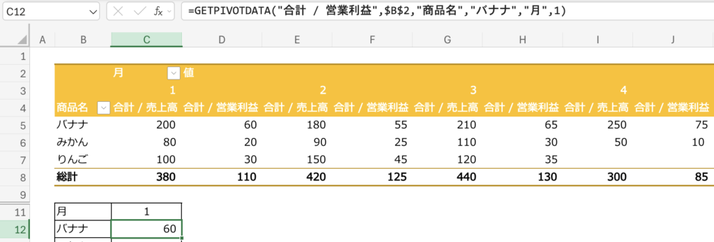 それを避けるために、ピボットテーブルからデータを引っ張ってくるときはGETPIVOTDATA関数を使います。