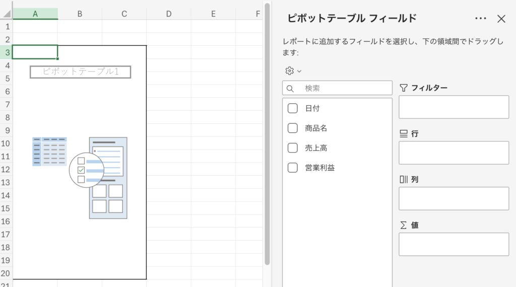 出来立てほやほやピボットテーブルには何のデータも追加されていないので、見たいデータにチェックを入れて、それを行に持ってきたいのか、列にしたいのか、それともデータとして値に持ってくるのか、ドラッグします。