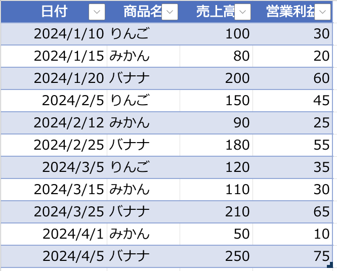 テーブル名は「売上利益」、ヘッダーは「日付」「商品名」「売上高」「営業利益」です。