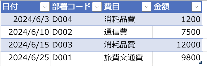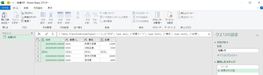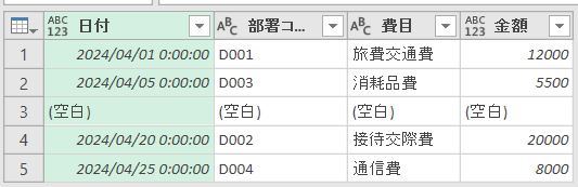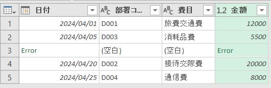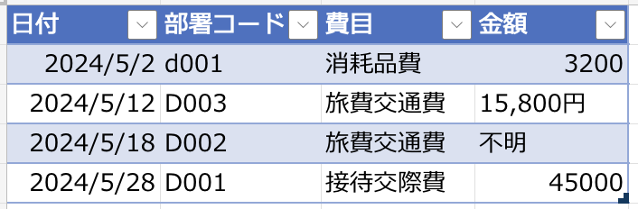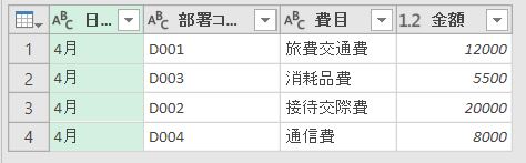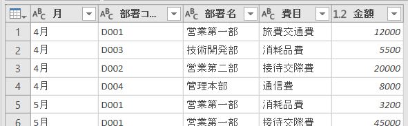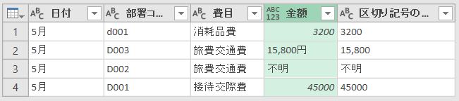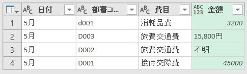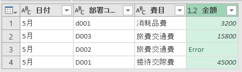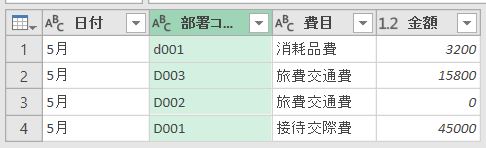 まずは日付の型を「日付」に変更し、部署コードと費目はテキストでいいのでそのままで、金額は10進数の「1.2」に変更しましょう。