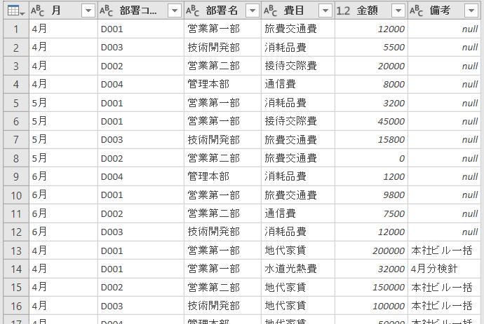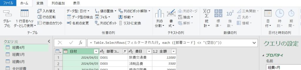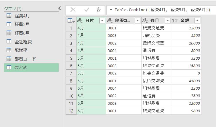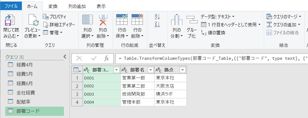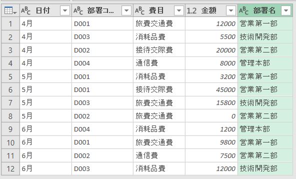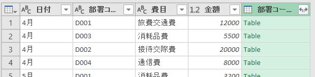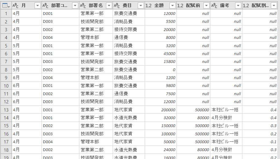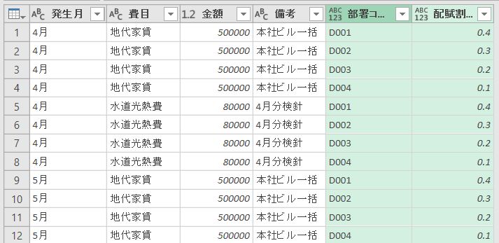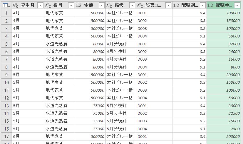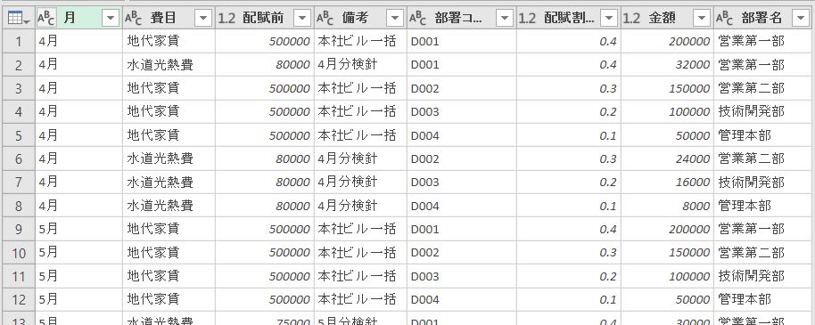 これをExcelのシートでやろうとすると「えーと、4月を費目別に4行にして、部署コードを入れて、XLOOKUPで配賦割合を引っ張ってきて…」と、ちょっと面倒な作業になりますが、パワークエリだとこの辺の作業は一瞬で済ませてくれます。楽です。