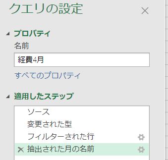 と、こうしていろいろ弄っていくと、「クエリの設定」の「適用したステップ」に記録されていきます。
