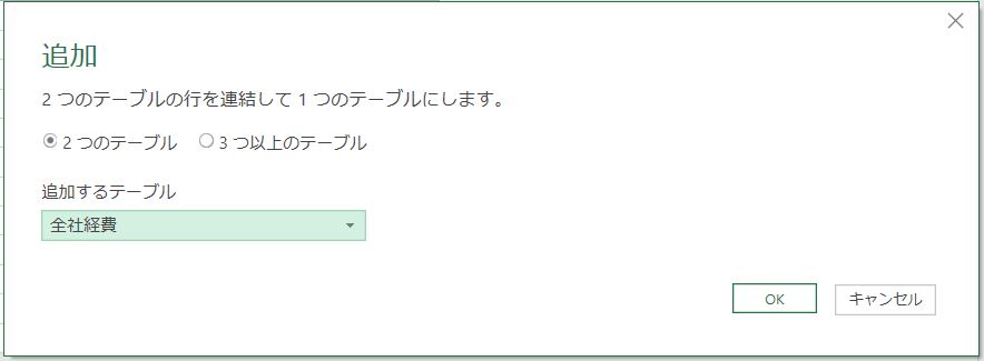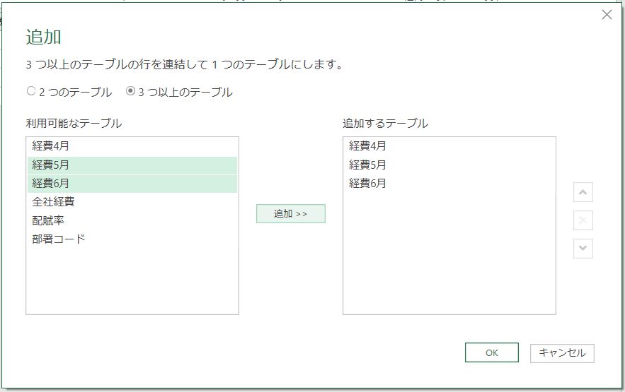 追加するテーブルを選択できます。今回は3カ月分あるので「3つ以上のテーブル」を選択して、該当するテーブルを「追加するテーブル」に放り込んでやります。