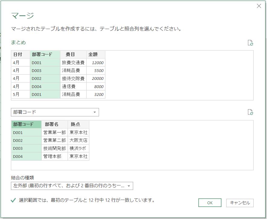 部署コードをキーにマージしてやると、「まとめ」はこんな風になります。