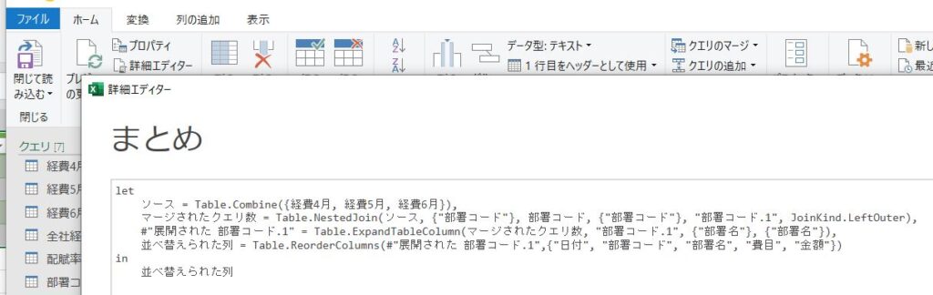 VBAを書くとき、慣れないうちはマクロの記録を使ってからコードを見て…とやっていたのが、慣れてくると直接コードを編集する方が速いように、パワークエリも「ここも同じように置換したい」とか「列はこの順番がいい」みたいな作業は詳細エディターでコピペからの修正でやっつけた方が楽になってきます。