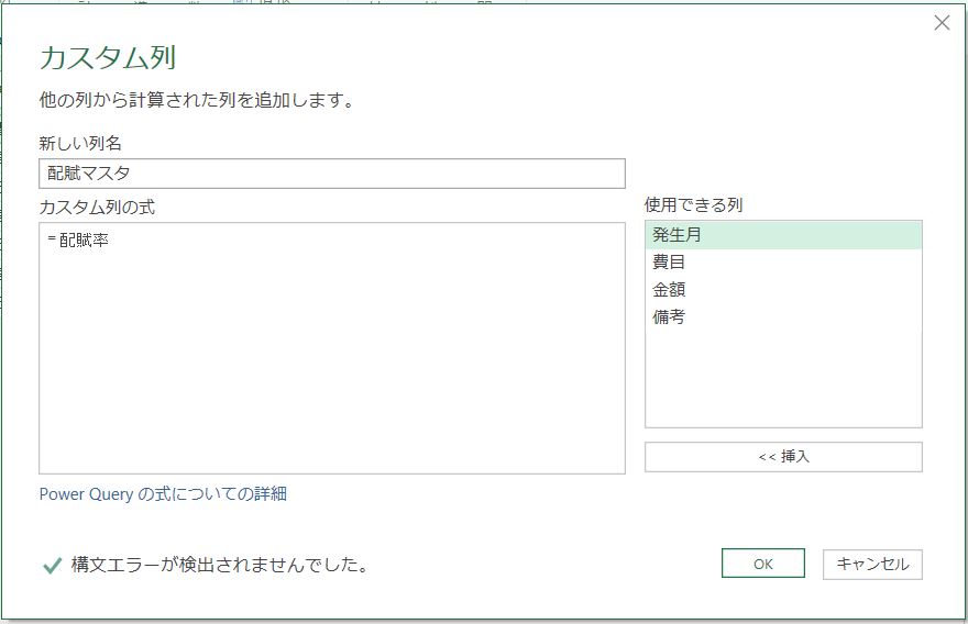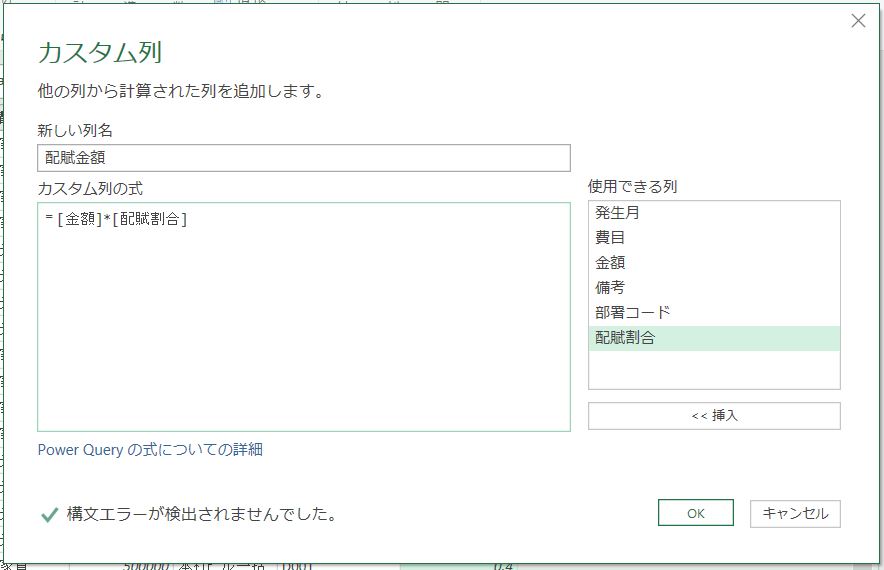 もう一度カスタム列を追加して、今度は金額*配賦割合の計算式を作成します。