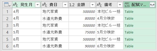 「配賦前」「備考」「配賦割合」と、「全社経費」テーブルにしかなかった列も勝手に増えていますね。