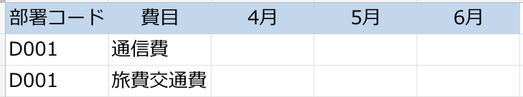「全社経費」には4月の地代家賃500,000というレコードしかないけれど、その金額を部署コード別・配賦割合別に分けたい、つまり4月の地代家賃の1レコードを4レコードにしたい。そんな作業になります。