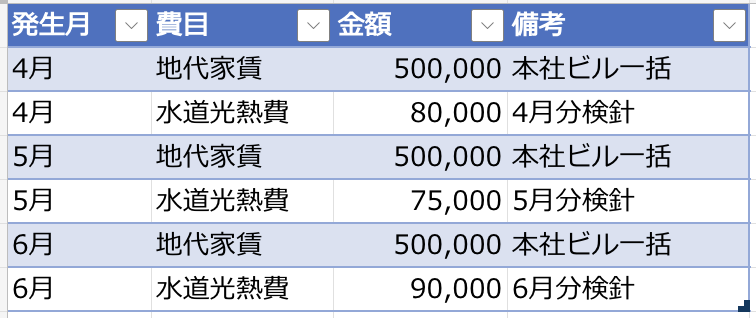 テーブル名は「経費4月」などにしています(なぜ「4月経費」でないかというと、テーブル名は頭に数字を持ってこれないから。なぜだ)。