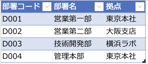 そういえば、ここには部署コードはありますが、部署名がないですね。このままだと人様に見せても「?」となるので、部署名を追加しましょう。