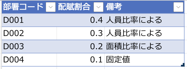 んで、「配賦率」テーブルで各部の負担割合とその考え方を示している、というカンジ。