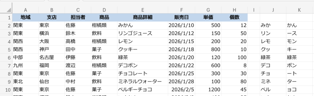 下の画像では、「商品詳細」の文字列に対して、J列にLEFT関数・K列にRIGHT関数が入っています。