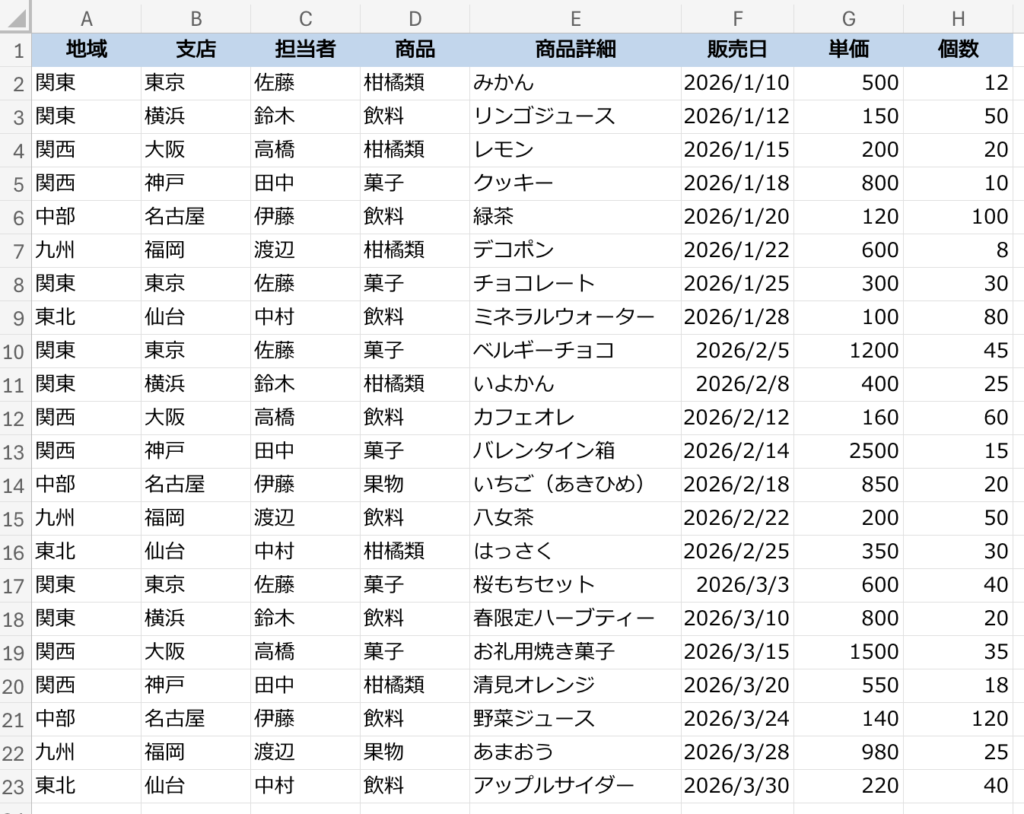 こんな風な販売データがあったとして、例を見ていきましょう。