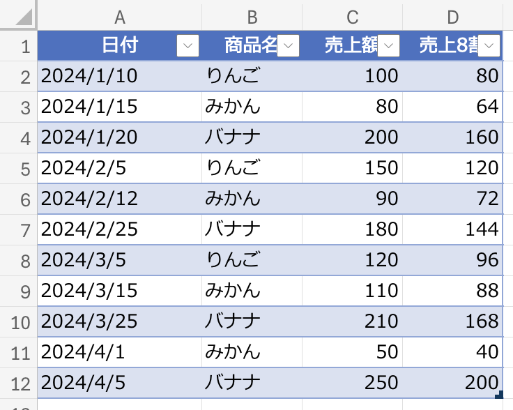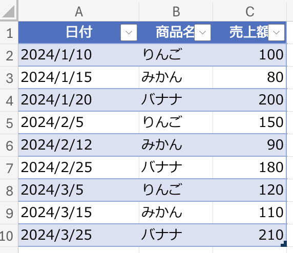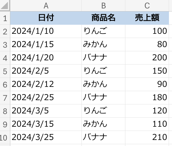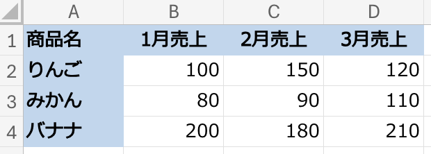 人間が見ると、「えっと、商品はどんな種類があるのかな、月別の売上額はどうなっているのかな」とすぐにはわからないので、イマイチなデータ形式に見えるかもしれません。
