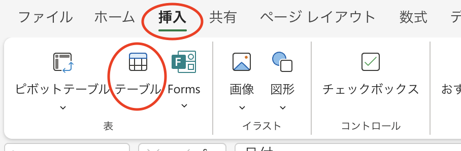 テーブル化するのは簡単です。テーブルにしたい範囲を選択して、「挿入」タブから「テーブル」をぽちっとするだけ。