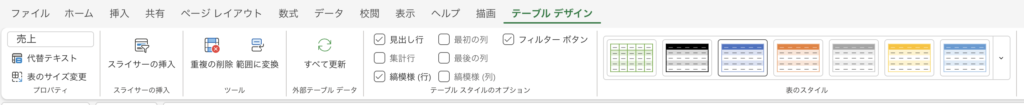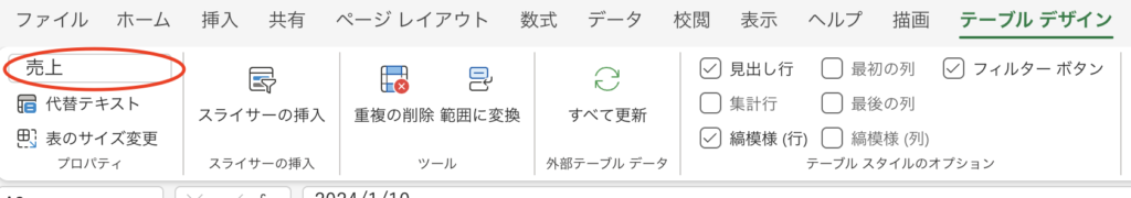 先ほどの「テーブルデザイン」タブの「プロパティ」内にボックスがあります。