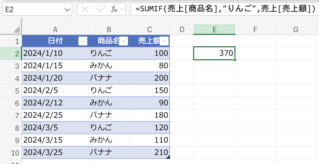 例えば先ほどテーブル化したデータのテーブル名を「売上」として、りんごの売上合計を計算すると。