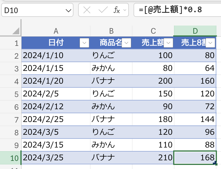 これ、テーブル化していないと、最初の行に入れた数式を下までずるーっとコピペしなきゃいけません。大した手間ではないかもしれませんが、何千何万行あるとそんなことも言えません。